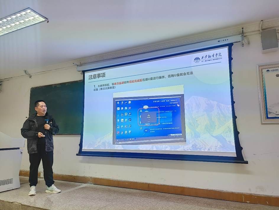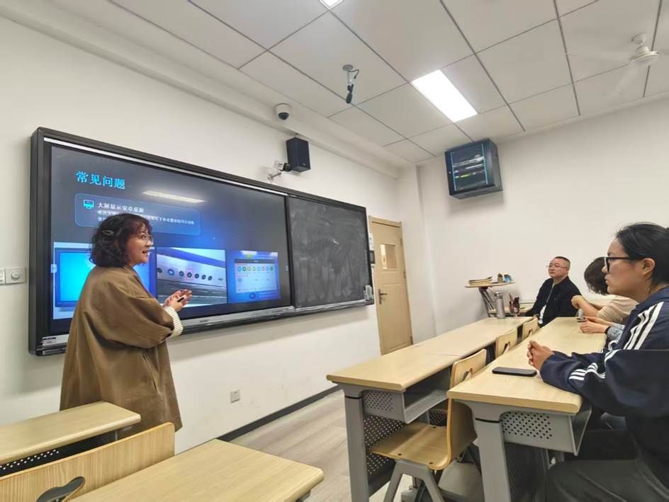 4月15日,8号教学楼智慧教室设备操作与信息化素养提升培训会在8111L教室举办。人文与艺术学部的部分师生代表参加了培训会。由8号教学楼管理老师王刚社老师主讲,本次培训聚焦希沃大屏、联想大屏、多媒体、研讨型四类智慧教室,详细讲解设备开关机、功能键操作、信号源切换等基础流程。针对信号异常、音频无输出、系统界面恢复等常见故障给出解决办法,明确课前课件备份、规范开关机、课后设备归位等使用规范,并公布了故障报修渠道。